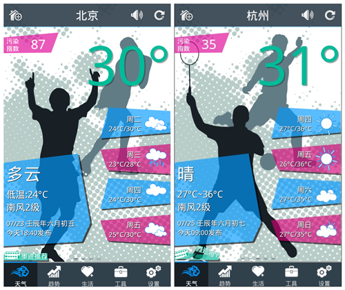 奥运版推出全新的英伦风格界面,以伦敦奥运标志色调为主,更有奥运项目背景随城市切换。让您身临其境,跃跃欲试!